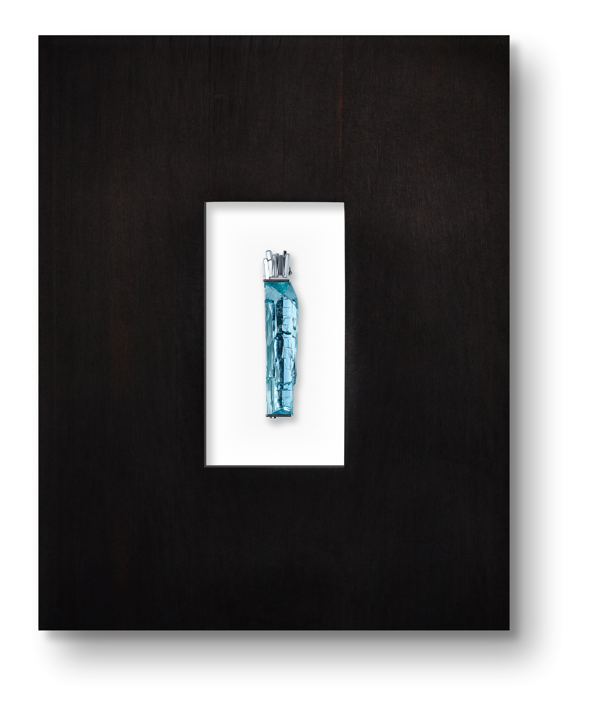 A soft illuminated mighty aquamarine of unique beauty presented free-floating in a frame of antique madegassischem ebony. Artfully and minimally arranged, the assemblage opens up a protected meditative space. Throughout geological eras, the millions-of-years-old gemstone makes direct contact with the viewer, drawing the eye into its oceanic blue and bizarre mineral structures. Purist and respectful, the “Precambrian Meditation” celebrates the fascination and unparalleled creative power of nature.